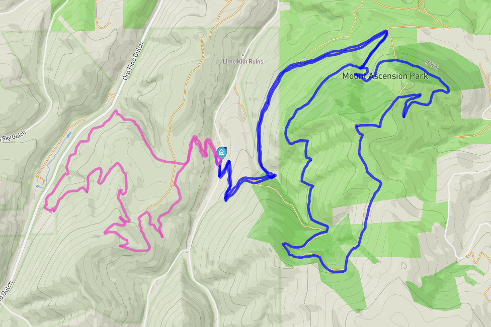 - Mt. Ascension Trail Loop: (Blue) Head partway up Entertainment, first left at Archery Range Trail, next right at Easy Rider Trail, next right at 2006 Trail, left on Mt. Ascension Loop Trail to summit saddle. Left to go down Entertainment Trail, right at the bridge for Aftershock, and left onto 2006 Trail to return to Old Shooting Range TH the way you came. 7.5 miles, 1,630 feet gain/loss.